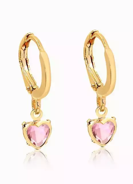 Brinco click coracao rosa, turmalina e lilas banhado a ouro (escolha a cor)