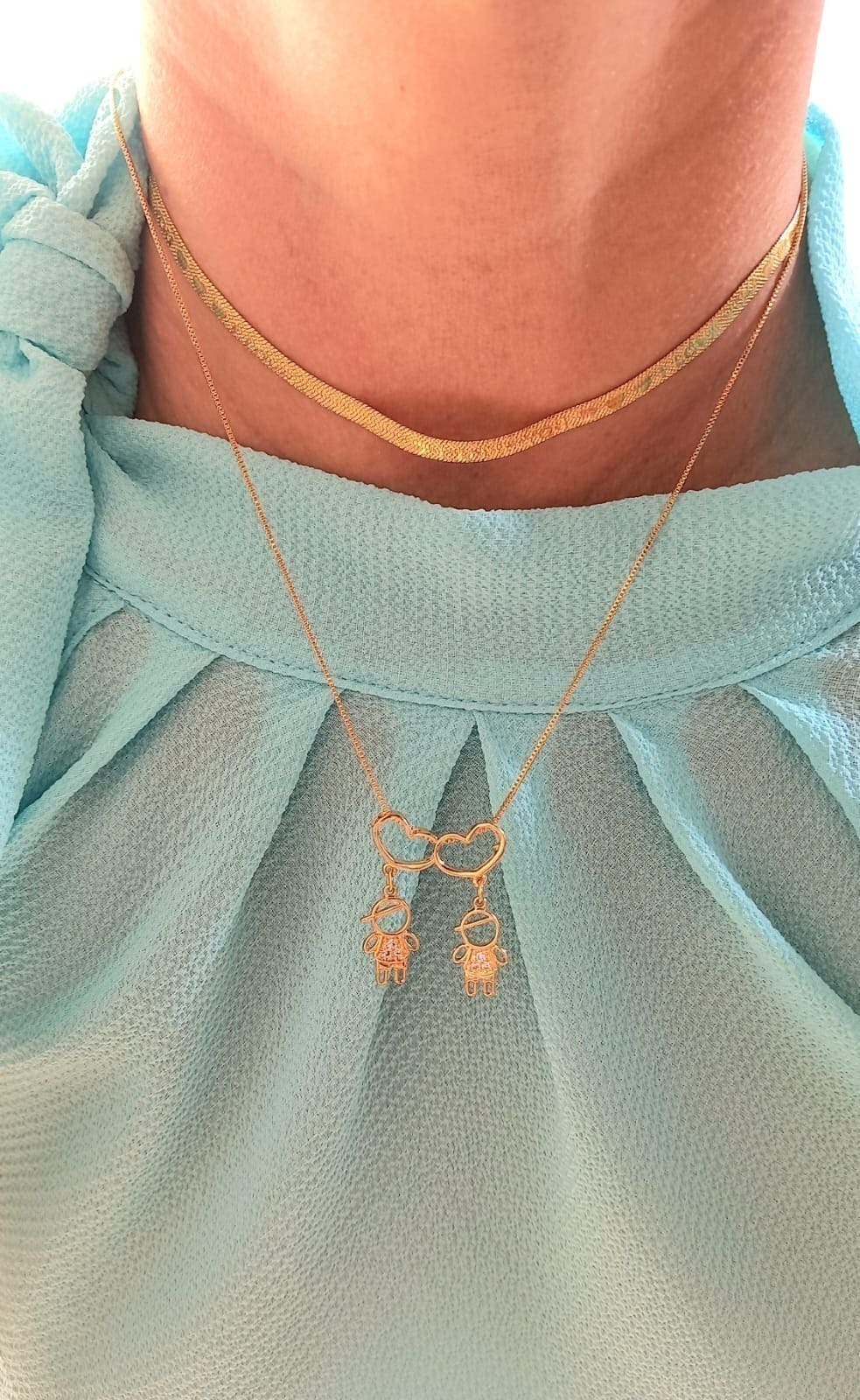 Colar com pingente coração vazado com 2 filhos (2 meninos) amore zircônias brancas folheado a ouro 18k